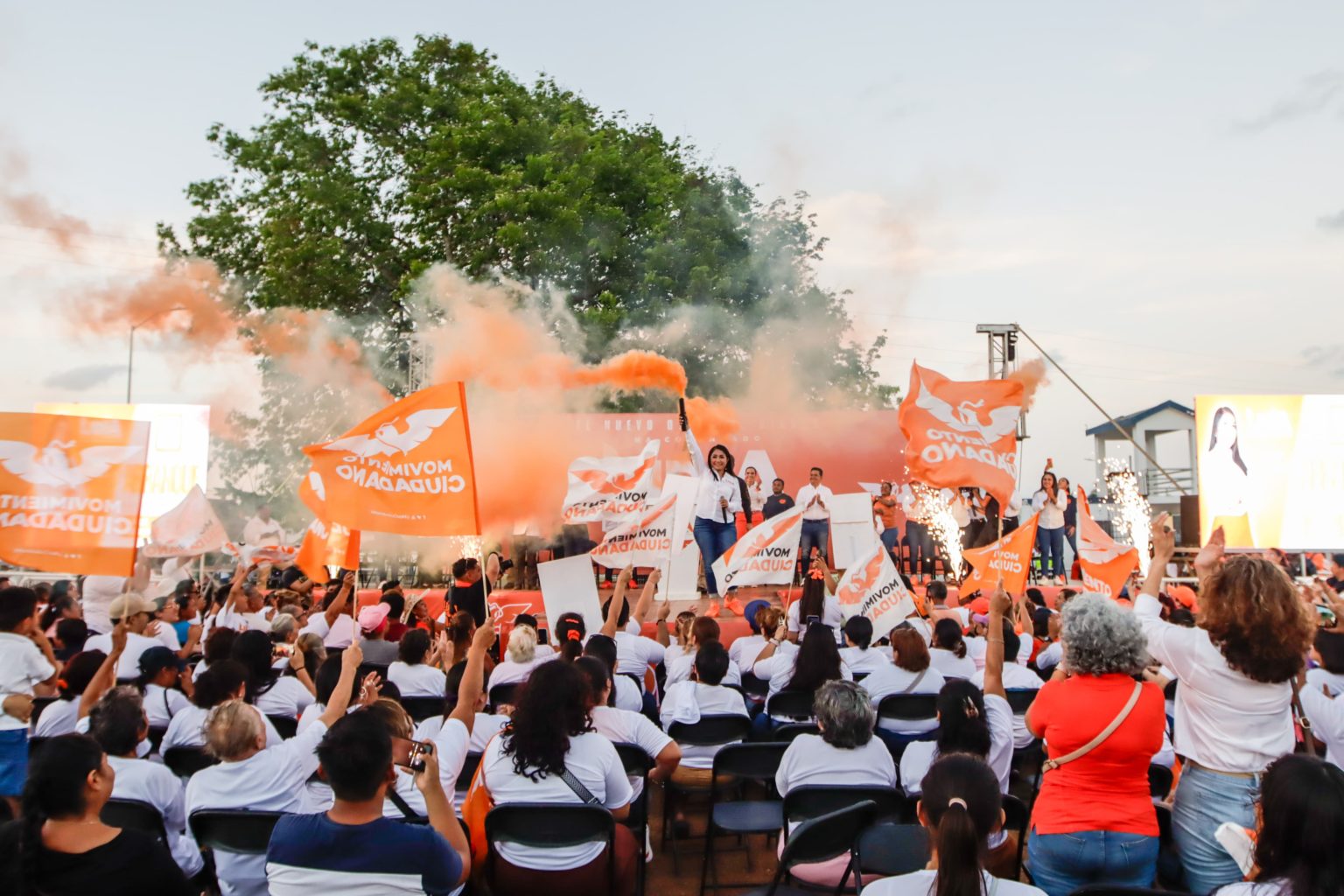 Chetumal, Quintana Roo, 16 de abril de 2024. – Habitantes del fraccionamiento Las Américas arropan a Lidia Rojas en el arranque de su campaña por la presidencia de Othón P. Blanco, es precisamente en este punto de la ciudad donde más se sienten las carencias de los gobiernos anteriores, que la candidata de Movimiento Ciudadano llamó a la población a cambiar el rumbo de Chetumal.