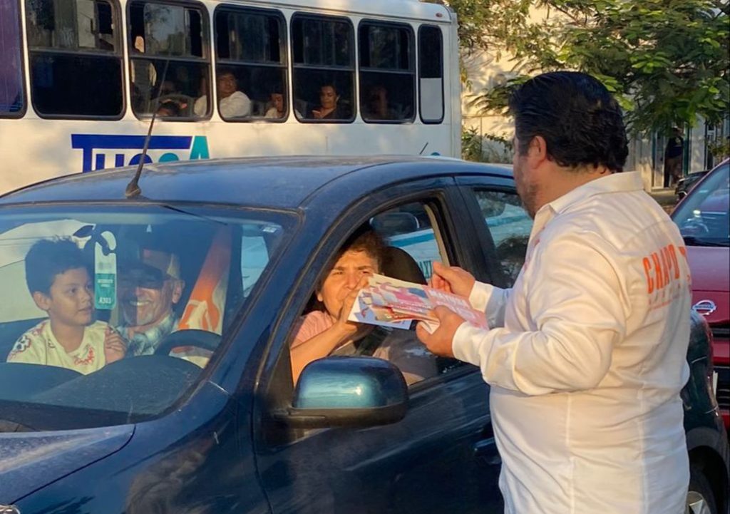 Playa del Carmen, Quintana Roo, 08 de abril de 2024. – Campaña de suelo, sudor y saliva aplica Carlos “Chapo” Guerra, candidato a Diputado Federal del Partido Movimiento Ciudadano por el Distrito 1, quien hizo presencia en los principales cruzamientos y vialidades de la ciudad de Playa del Carmen, para dialogar directamente con los ciudadanos que hacían alto en sus vehículos.