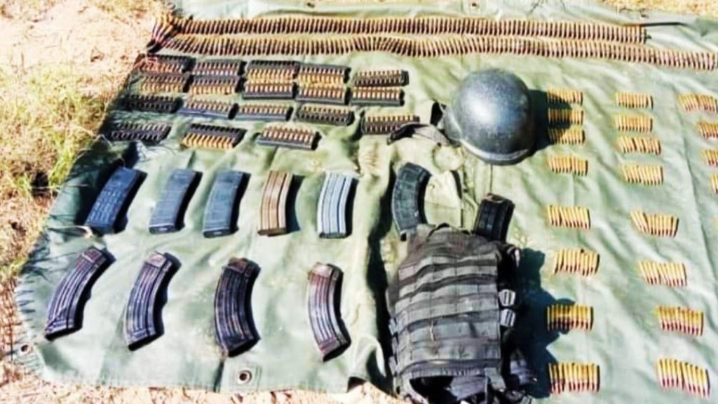También 380 cartuchos útiles calibre 5.56, tres cargadores calibre 5.56 desabastecidos, un cargador de plástico calibre 7.62 desabastecido, tres cargadores de metal calibre 5.56 desabastecido, cuatro cargadores de metal calibre 7.62 desabastecido, un casco balístico y un chaleco táctico.