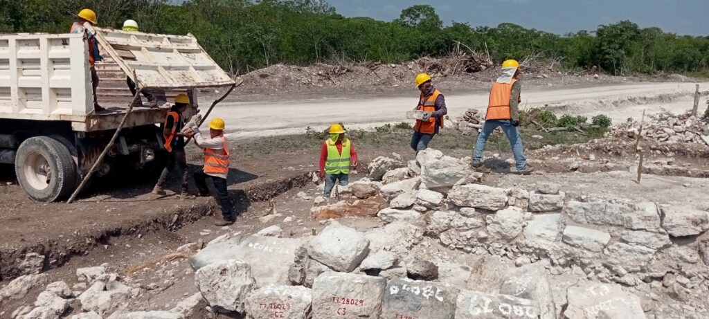CAMPECHE, 26 de Agosto. – En un futuro próximo, las y los usuarios del Tren Maya que arriben a la estación Calakmul podrán admirar un antiguo conjunto palaciego, el cual fue localizado a 3.5 kilómetros de allí, durante la prospección arqueológica que acompañó la construcción del Tramo 7 de la línea ferroviaria. Un equipo de especialistas lleva a cabo la afanosa tarea de restituir cuatro monumentos, piedra por piedra.