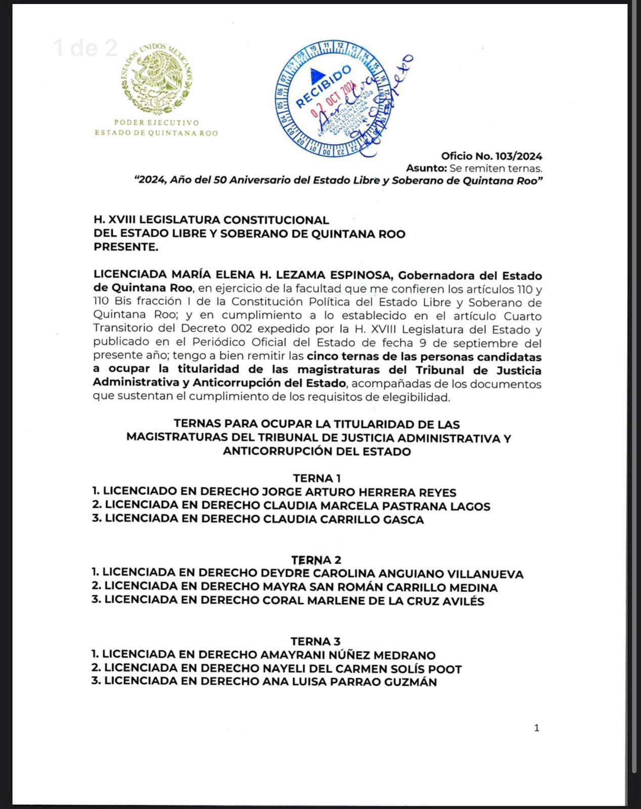 CHETUMAL, Quintana Roo, 2 de octubre. — Solo mujeres figuran en las cinco ternas turnadas por la gobernadora de Quintana Roo, Mara Lezama Espinosa al Congreso del estado, con el nombre de las aspirantes a Magistradas del Tribunal de Justicia Administrativa y Anticorrupción (TJAA), entre las que destaca, la ex magistrada del Tribunal Electoral del Estado (Teqroo), Claudia Carrillo Gasca y la ex Consejera Presidenta del Instituto Electoral de Quintana Roo (Ieqroo) Mayra San Román Medina.