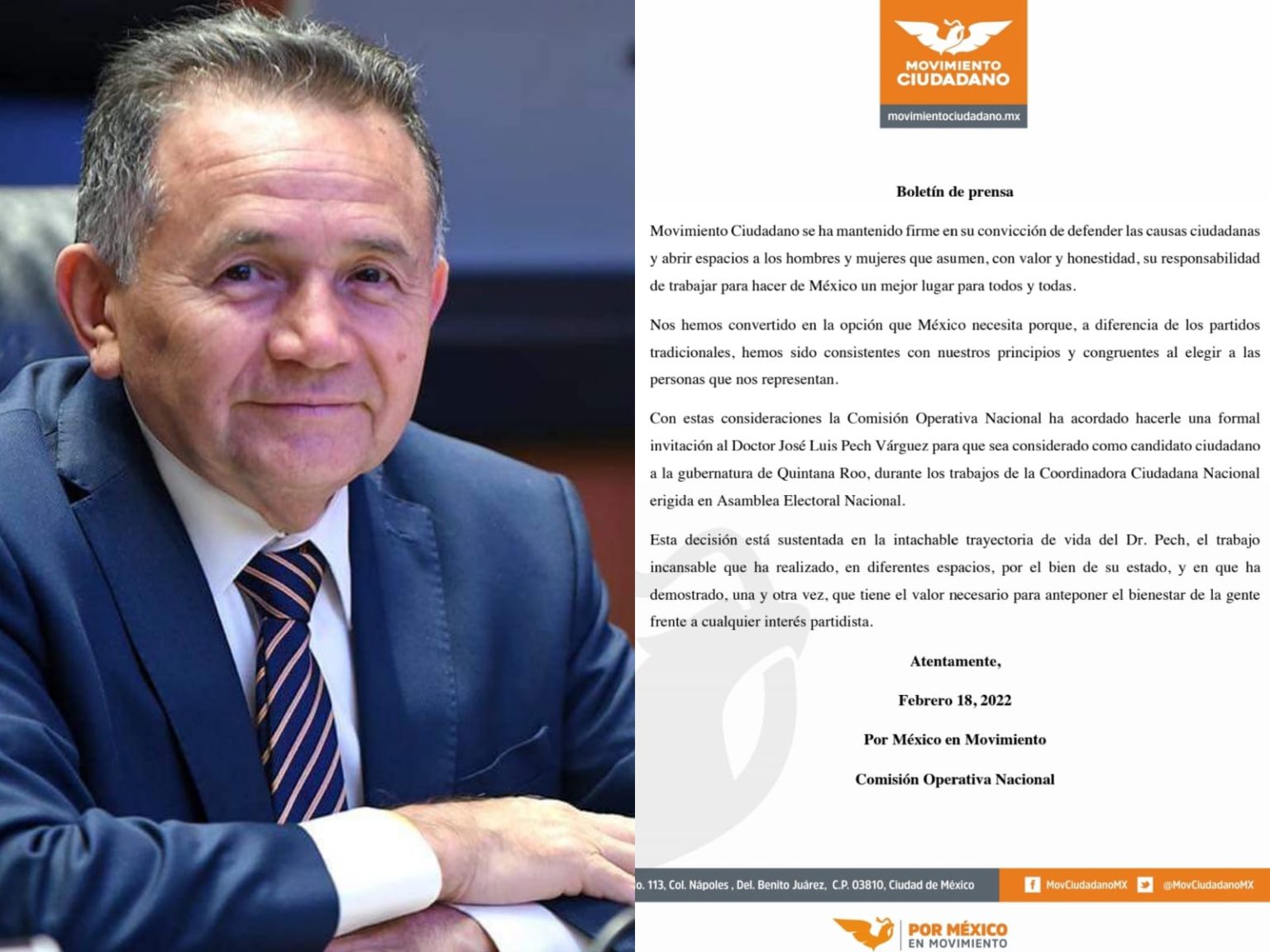 “Con estas consideraciones la Comisión Operativa Nacional ha acordado hacerle una formal invitación al Doctor José Luis Pech Várguez para que sea considerado como candidato ciudadano a la gubernatura de Quintana Roo, durante los trabajos de la Coordinadora Ciudadana Nacional erigida en Asamblea Electoral Nacional”, precisa el comunicado.