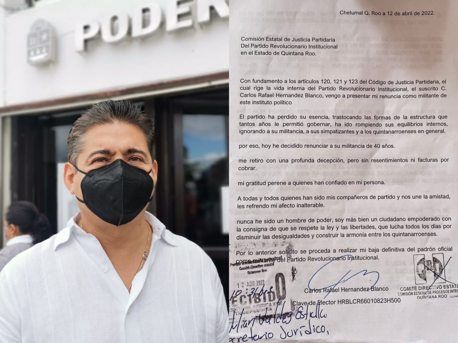 El diputado aseguró que el 12 de abril presentó su renuncia al PRI partido en el que milito por 40 años, y al que agradeció la oportunidad de ocupar cargos como: Presidente del Comité Estatal; Regidor en Mérida, Yucatán; Diputado local de la Novena Legislatura del Congreso local ; Presidente Municipal de Cozumel y nuevamente diputado de la Décimo Sexta Legislatura en el Congreso de Quintana Roo.