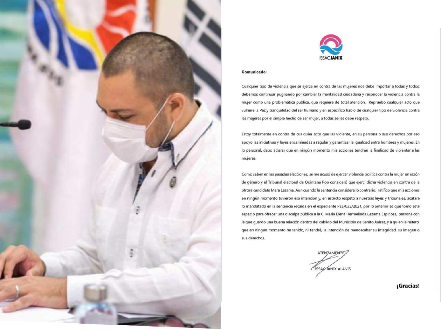 CANCÚN, Quintana Roo, 10 de agosto. – Issac Jánix Alanís ex candidato a la presidencia municipal de Benito Juárez ofreció una disculpa pública a la alcaldesa de Cancún, Mara Lezama Espinosa, para cumplir con la sanción interpuesta por el Tribunal Electoral de Quintana Roo (Teqroo) al encontrarlo culpa de ejercer Violencia Política de Género.