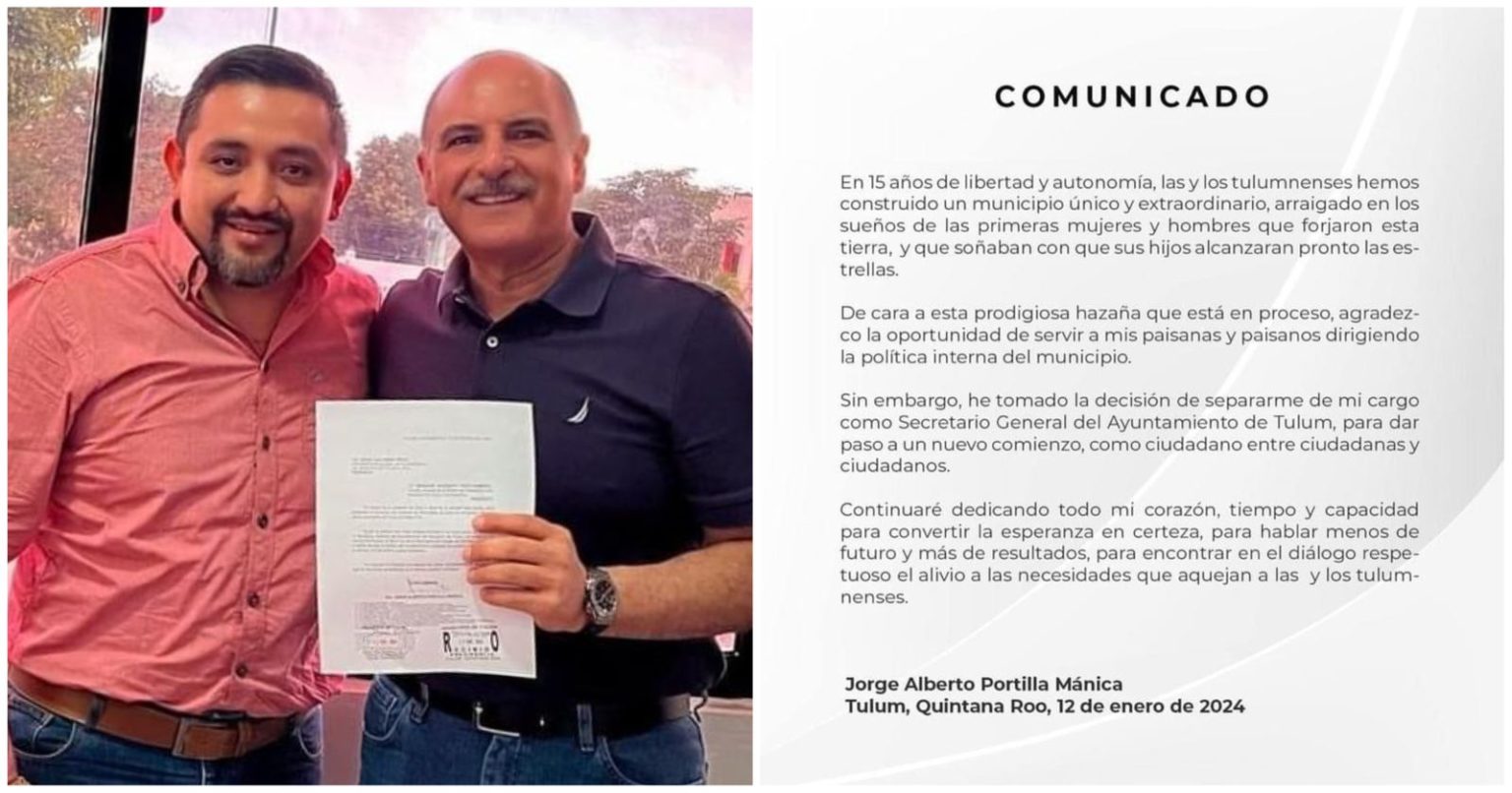 Tulum, Quintana roo, 12 de enero de 2024. – Jorge Alberto Portilla Mánica presentó hoy su renuncia al cargo de secretario general del ayuntamiento de Tulum para sumarse, dice, a las y los ciudadanos comunes.