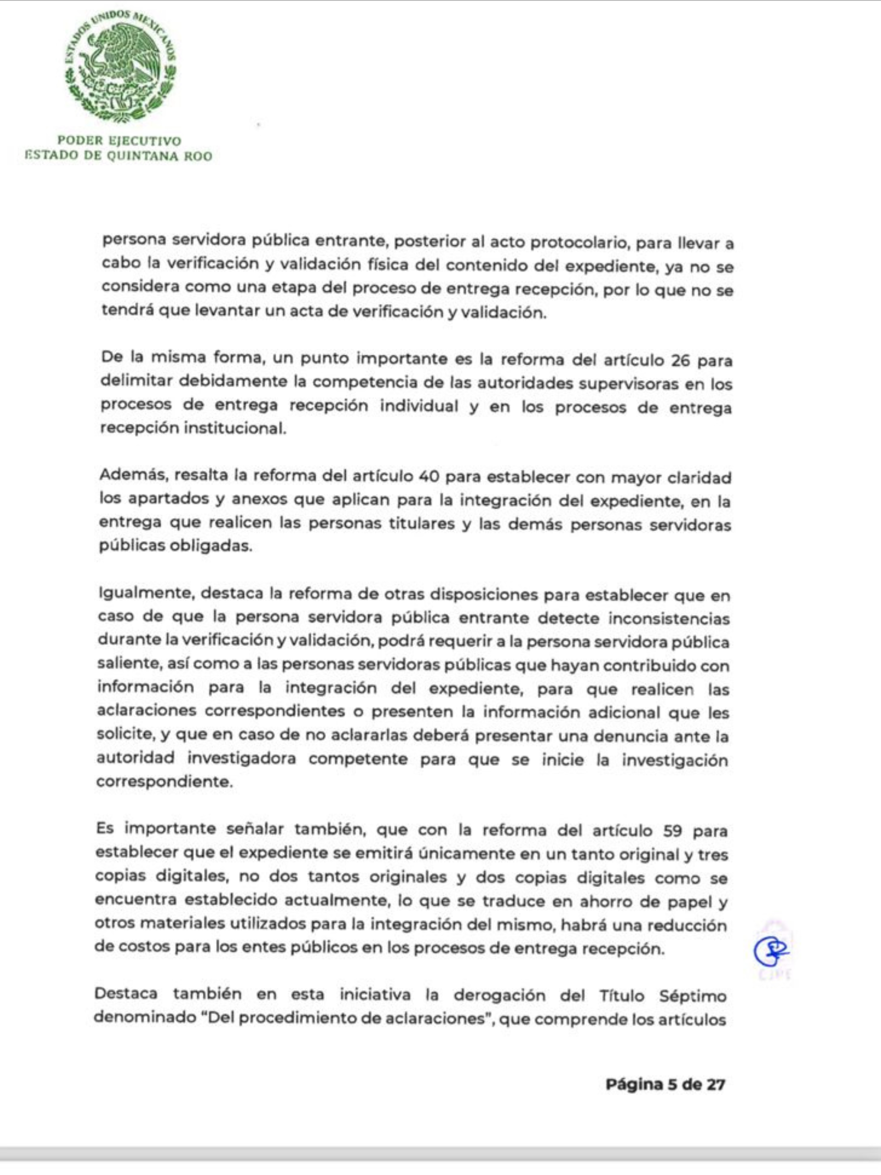 La iniciativa entra en vigor, una vez que sea aprobado por el pleno de la Décimo Séptima Legislatura y entrará en vigor al día siguiente de su publicación en el Periódico Oficial del Estado de Quintana Roo.