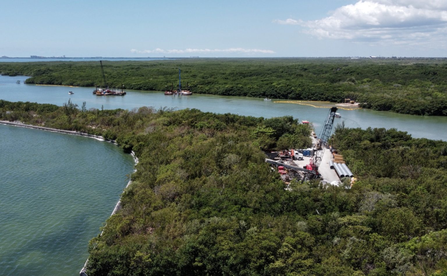 Cancún, Quintana Roo, 23 de mayo. – El Gobierno Federal inició labores de dragado en la Laguna Nichupté de Cancún, como parte de las obras del Puente Nichupté.