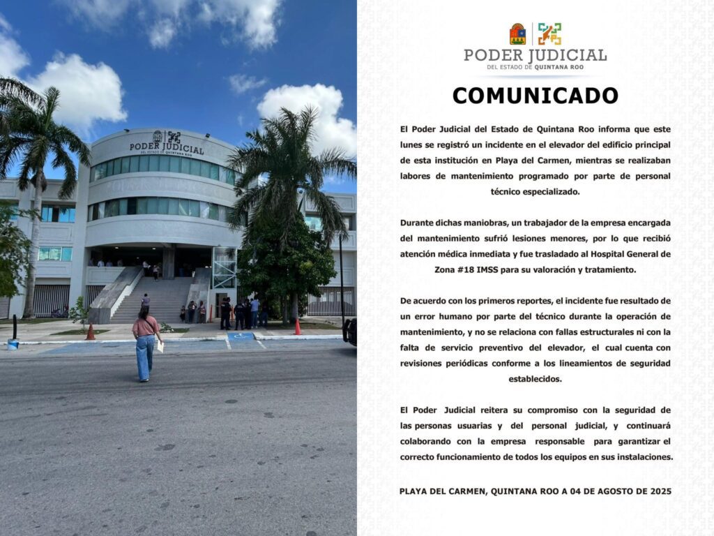 “El Poder Judicial del Estado de Quintana Roo informa que este lunes se registró un incidente en el elevador del edificio principal de esta institución en Playa del Carmen, mientras se realizaban labores de mantenimiento programado por parte de personal técnico especializado.