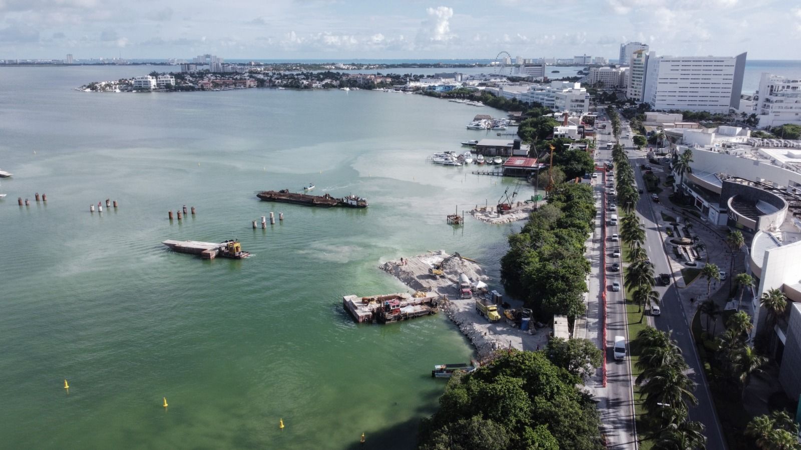 A 27 días de la salida de AMLO del gobierno es el puente de 8.8 kilómetros que unirá el centro de la ciudad con la zona de playas. En estas imágenes se ve la obra justo frente a Plaza Kukulkán y lejos al fondo, Malecón Tajamar, donde los avances son mayores. Autoridades reportan este día un avance global de la obra superior al 60 por ciento.