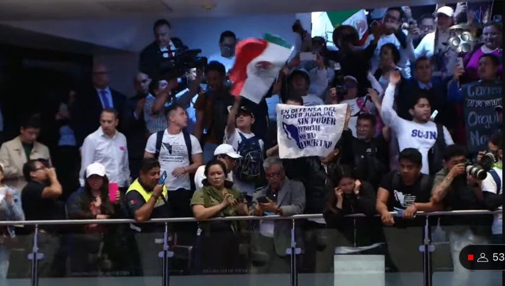 CIUDAD DE MÉXICO, 10 de Septiembre.- Al grito de “¿en dónde están? ¿en dónde están?, los senadores que nos iban a escuchar”, “traidores” y “el Poder Judicial no va a caer, no va a caer”, el contingente invadió el Patio del Federalismo y decenas de personas ingresaron a los palcos de prensa y de visitantes, lo que obligó a la Mesa Directiva encabezada por el petista, Gerardo Fernández Noroña a a decretar un receso indefinido.