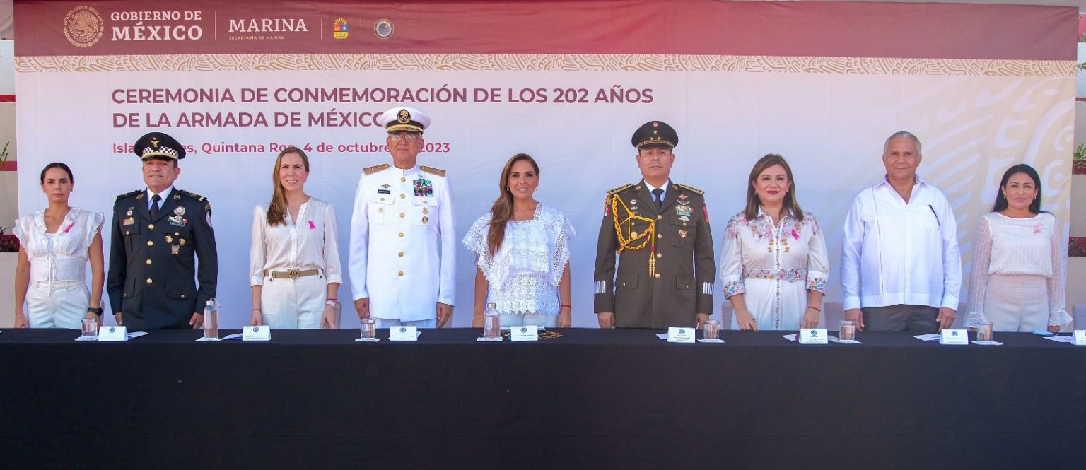 Isla Mujeres, Quintana Roo, 04 de octubre. – La gobernadora Mara Lezama Espinosa y el almirante del Cuerpo General DEM Abraham Eloy Caballero Rosas, comandante de la Novena Región Naval, encabezaron la ceremonia conmemorativa al 202 Aniversario de la Creación de la Armada de México.