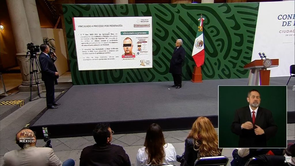 En la sección Cero Impunidad, el Subsecretario de Seguridad Pública federal, General Luis Rodríguez Bucio, informó que fue vinculado a proceso Ricardo “N”, en Baja California; esta persona fue detenida en Cancún por los delitos de abuso sexual y pederastia agravada en contra de 14 alumnos de una escuela primaria de Mexicali.