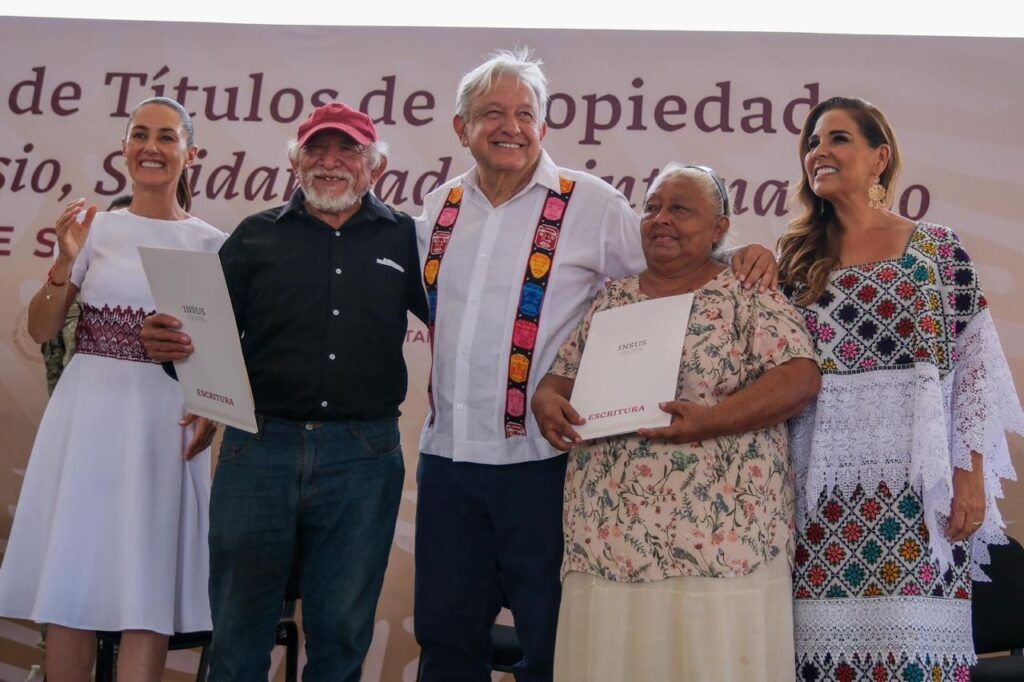 PLAYA DEL CARMEN, Quintana Roo 6 de Septiembre. — El presidente Andrés Manuel López Obrador, la presidenta electa Claudia Sheinbaum y la gobernadora Mara Lezama Espinosa entregaron hoy los primeros mil 774 títulos de propiedad, de un total de 3 mil 913 lotes, a habitantes de la colonia Colosio, en un acto histórico que culmina con una larga etapa de incertidumbre y desesperanza y que cumple con la palabra presidencial de resolver este problema.