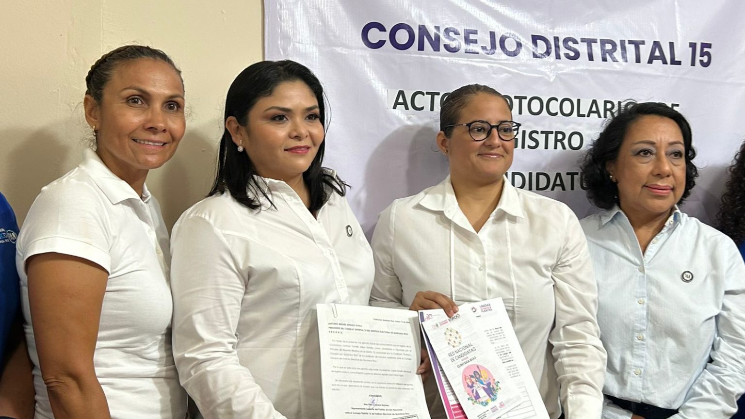 Chetumal, Quintana Roo, 13 de marzo de 2024. – Cinthya Millán Estrella se inscribió este miércoles como candidata a la diputación de mayoría relativa por el Distrito XV, acompañada de su compañera de fórmula Patricia Carrillo.