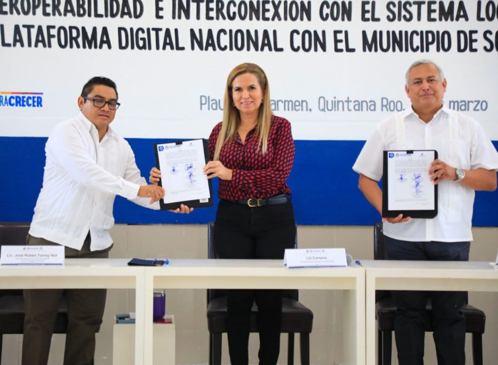 PLAYA DEL CARMEN, Quintana Roo, 18 de marzo. –  La presidenta de Solidaridad Lili Campos firmó el convenio de colaboración con la Secretaría Ejecutiva del Sistema Anticorrupción de Quintana Roo (SESAEQROO) representada por Luis Anica Rodríguez, que funge como enlace entre ese sistema estatal y municipal en la gestión y transmisión de información, interoperabilidad e interconexión con el sistema local de información del SAEQROO y la plataforma digital nacional.
