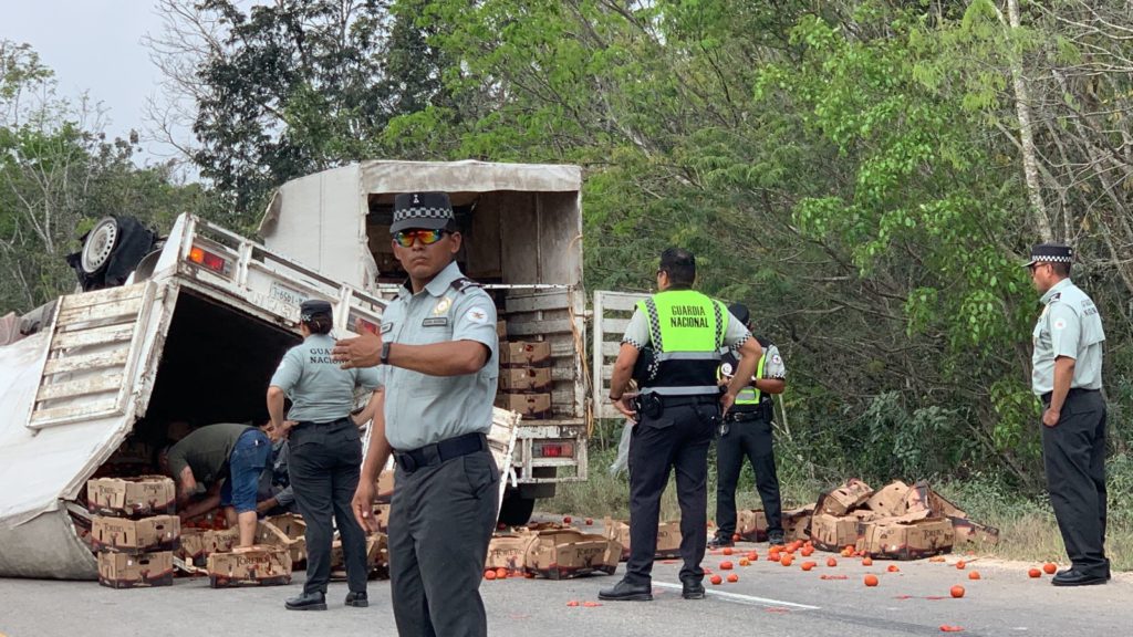 Otra camioneta de la empresa chetumaleña acudió al auxilio para rescatar los tomates, mientras personal de la Guardia Nacional “controlaba” el tráfico.