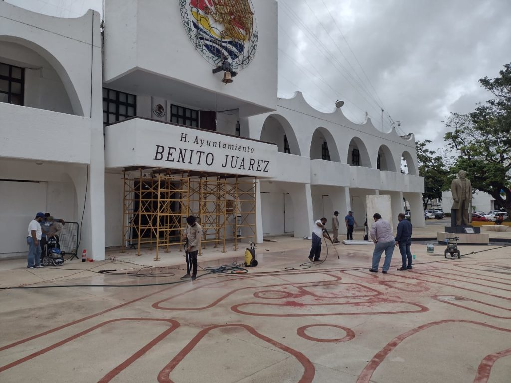 CANCÚN, Quintana Roo, 10 de septiembre.- Desde temprana hora, personal de Servicios Generales se dedicaron a limpiar el Palacio Municipal y la Plaza de la Reforma, vandalizados ayer como parte de una manifestación del Comité de Víctimas del 9N. (Día en que la policía municipal, disolvió a balazos la manifestación en contra de los feminicidios, donde 2 periodistas resultaron heridos).