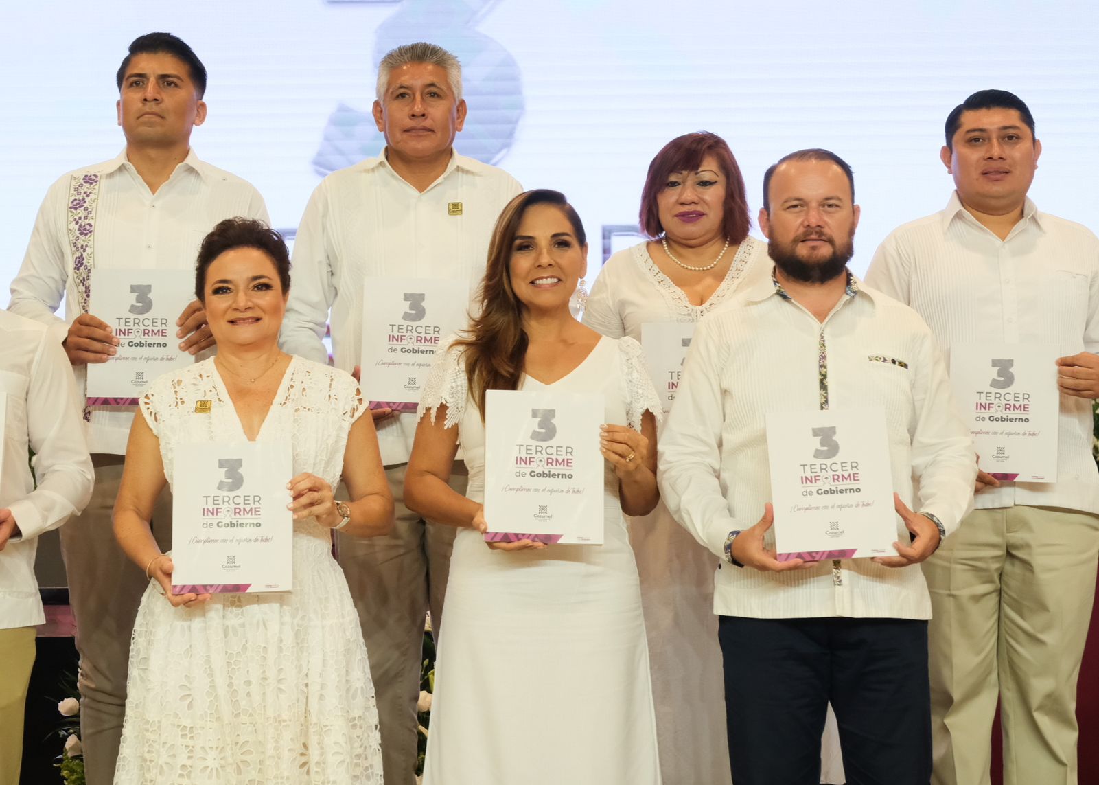 La gobernadora Mara Lezama; el presidente del Tribunal Superior de Justicia, magistrado Heyden Cebada Rivas; y el representante del Poder Legislativo, diputado Renán Sánchez Tajonar recibieron el documento que contiene la glosa del Informe.