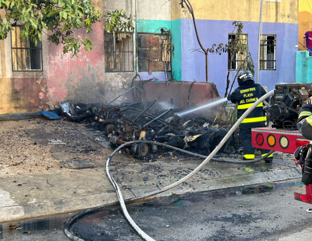 PLAYA DEL CARMEN, Quintana Roo, 10 de Julio. –  Por lo menos cuatro carritos de golf que estaban estacionados afuera de una vivienda ubicada en el fraccionamiento Villas del Sol, terminaron calcinados, esto luego de que se incendiaron; las autoridades sospechan que fue provocado.