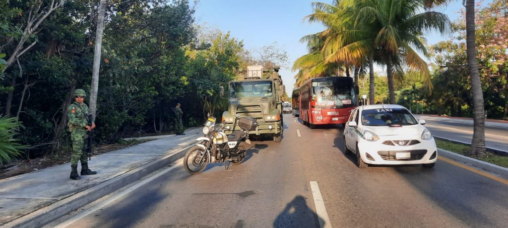 Aunque no se precisó el punto en que quedó la unidad de la Secretaría de la Defensa Nacional (SEDENA), reportes de ciudadanos en redes sociales establecieron que la reducción a un carril en el acceso a la zona hotelera del lado de la laguna Nichupté fue de varios kilómetros.