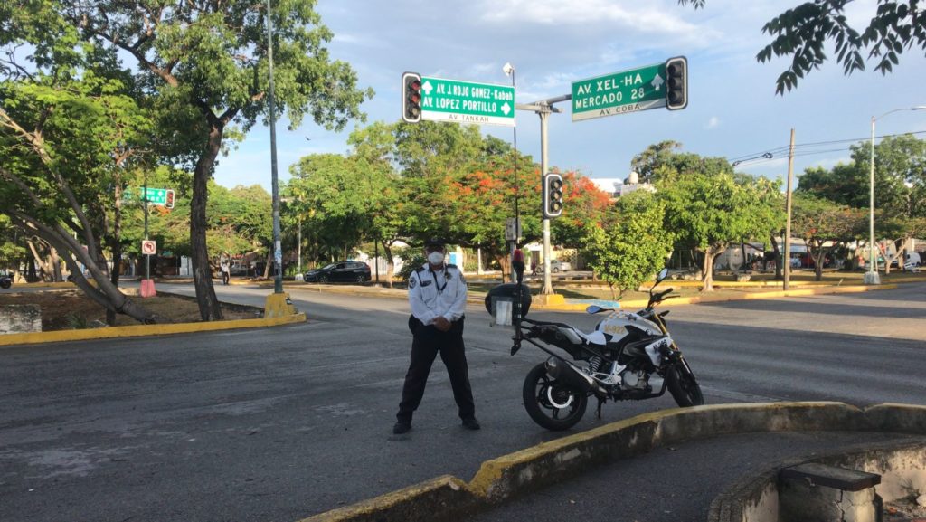 Hay que recordar que el semáforo de Kabah con Chichén-Itzá fue derribado en su totalidad en una persecución a balazos entre grupos criminales en la madrugada del jueves 29 de julio, desde entonces agentes municipales dan vialidad en el transitado cruce.