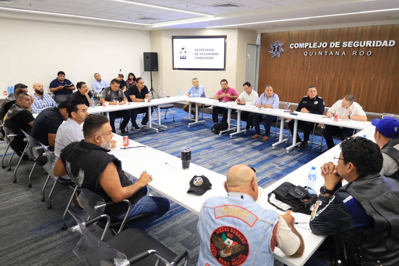 CANCÚN, Quintana Roo, 19 de Septiembre.-Representantes de motociclistas se reunieron con la encargada de la política interna en el estado, la secretaria de Gobierno, Cristina Torres así como autoridades estatales y municipales, en el Complejo de Seguridad C5 para avanzar en el proceso de regularización y emplacamiento de sus vehículos.