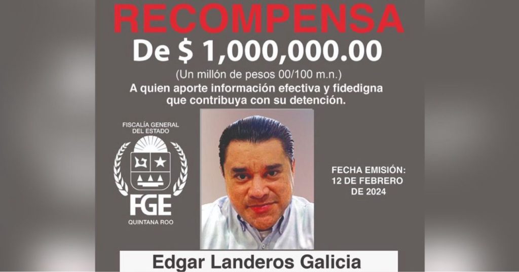 Cancún, Quintana Roo, 17 de febrero de 2024.- La Fiscalía General del Estado anunció una recompensa de un millón de pesos para aquellas personas que proporcionen información efectiva y fidedigna que coadyuve a la detención de Edgar Landeros Galicia, quien enfrenta cargos por el delito de violación.