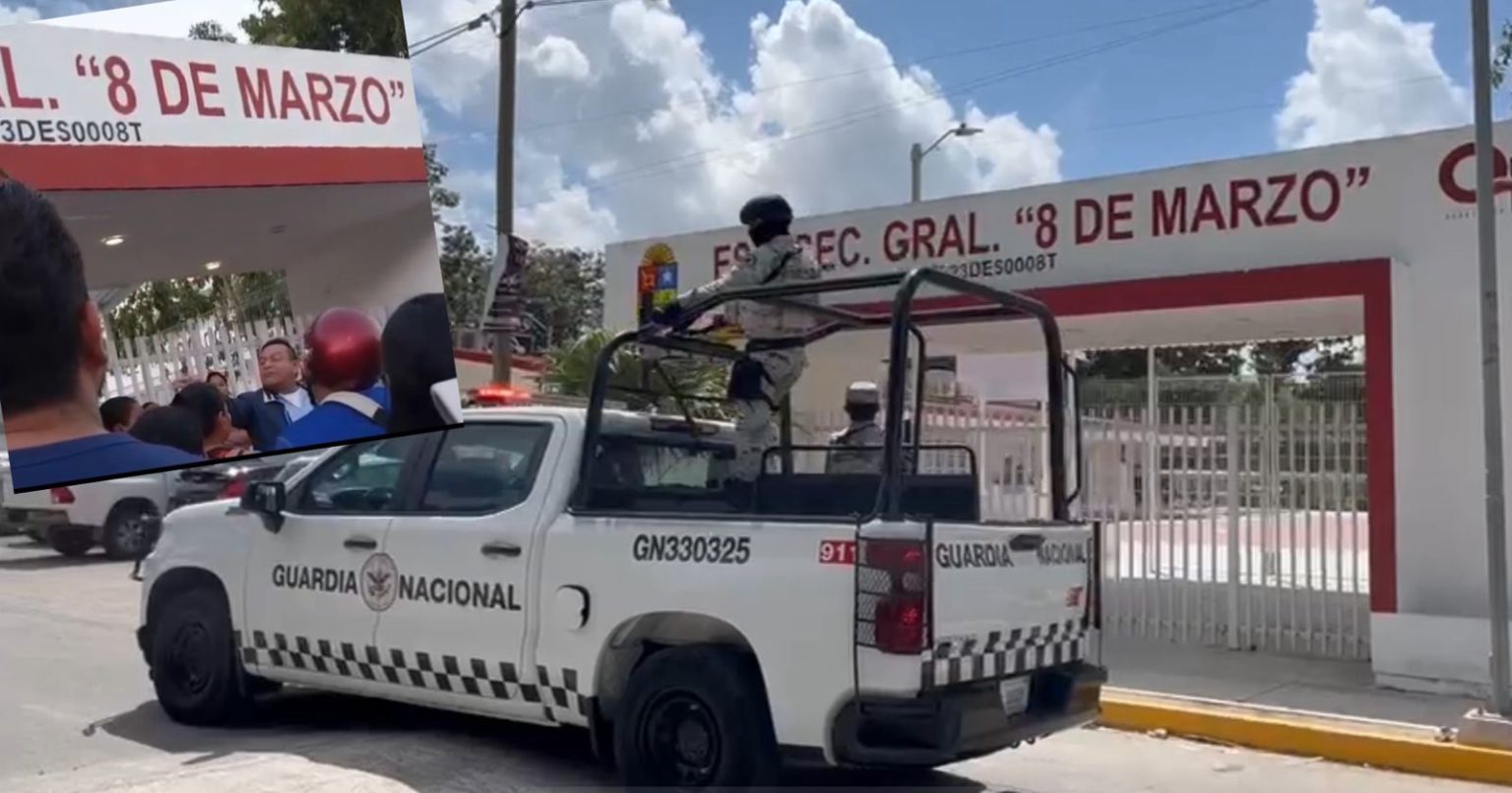 Cancún, Quintana Roo, 04 de marzo de 2024. – Un grupo de madres y padres de familia se reunieron a las afueras de la secundaria 8 de Marzo, para exigir seguridad para los jóvenes, ante los constantes reportes de detonaciones y narcomantas colgadas en la zona.