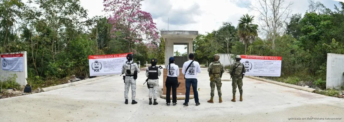 Benito Juárez.- La Fiscalía General del Estado informa que, en coordinación con elementos de la Secretaría de Marina y de la Guardia Nacional, cumplimentó una orden de cateo girada por un Juez de Control en un predio donde se desarrolla un proyecto inmobiliario, ubicado en el ejido Alfredo V. Bonfil, en este municipio.