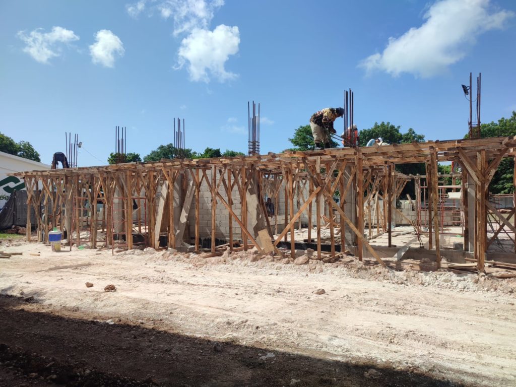 Detalló que, la cimentación de las dos aulas ha concluido, así como el murete de enrase, el suministro y compactación de material inerte de banco, el vacío de concreto en columnas y actualmente se trabaja en la habilitación, armado y colocación de cimbra aparente y acero reforzado de diferentes diámetros en trabes.