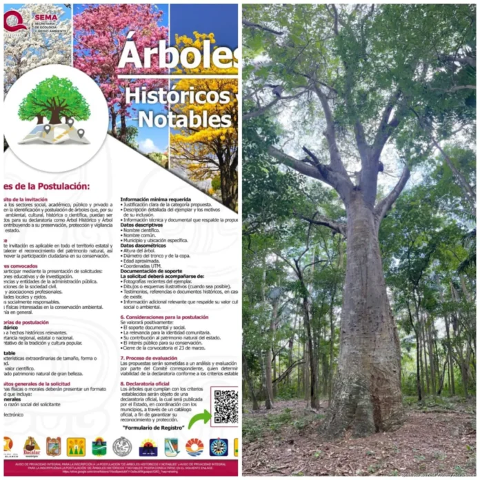 Chetumal.- En una entidad donde la selva y el arbolado urbano forman parte esencial de la identidad territorial, el Gobierno del Estado a través de la Secretaría de Ecología y Medio Ambiente (SEMA) abrió la convocatoria para identificar y postular ejemplares que, por su relevancia ambiental, cultural, histórica o científica, puedan ser declarados Árbol Histórico o Árbol Notable.