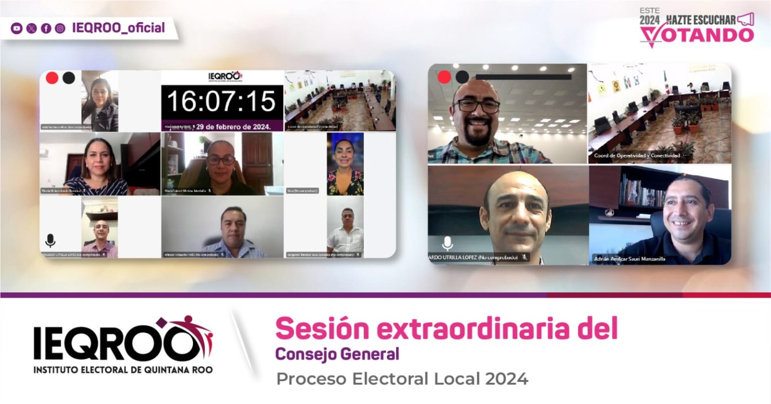 Chetumal, Quintana Roo, 29 de febrero de 2024. – Integrantes del Consejo General del Instituto Electoral de Quintana Roo (IEQROO), en sesión extraordinaria aprobaron el acuerdo respecto al protocolo para la detección, recolección, entrega e intercambio de paquetes, documentación y materiales electorales recibidos en el órgano electoral distinto al competente, en la etapa de resultados y declaración de validez del Proceso Electoral Concurrente 2023-2024. La Ley local establece que se acordarán en los consejos municipales y distritales un mecanismo para la recolección de los paquetes electorales bajo vigilancia de los partidos políticos y candidatos independientes.