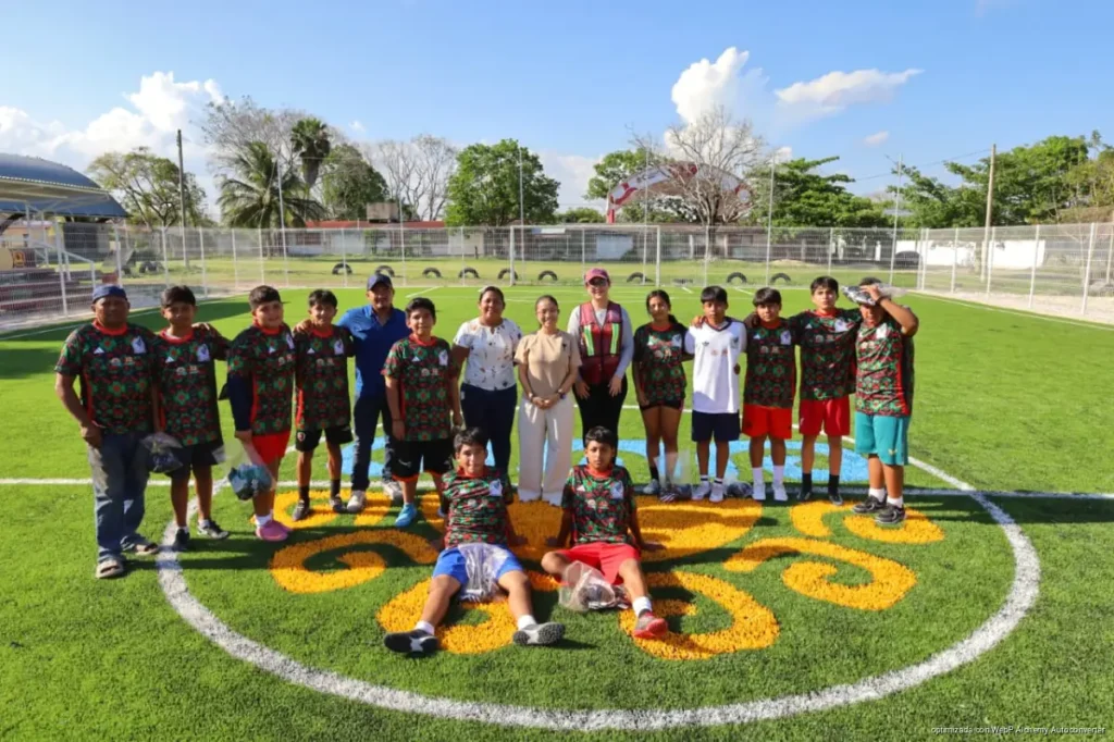 La presidenta municipal, Yensunni Martínez Hernández, entregó una nueva cancha de fútbol 7 en la comunidad de Ucum, una obra que representa un sueño cumplido para niñas, niños, jóvenes y familias enteras.