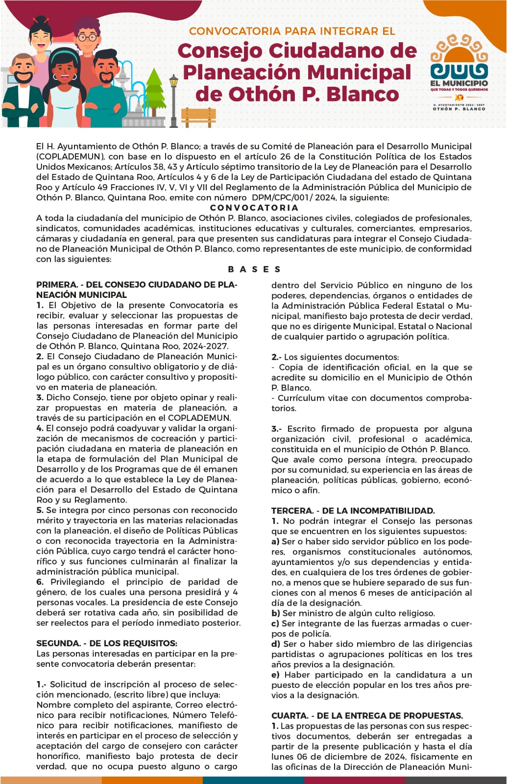 CHETUMAL, Quintana Roo,27 de Noviembre. – El Ayuntamiento del municipio de Othón P. Blanco ha publicado la convocatoria para la integración del Consejo Ciudadano de Planeación Municipal de Othón P. Blanco 2024-2027, invitando a todas y todos los interesados en ser parte de este órgano consultivo y propositivo en materia de planeación.