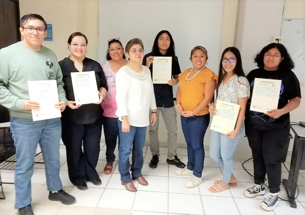 Recibieron el certificado de acreditación en nivel HSK 1, Ignacio de Jesús Villa Rosado, Daniela Izquierdo Loeza, Jonatan Geovany Díaz Chulim, Karina Izebel Herrera Mazú; en el nivel HSK 2, Gabriela Elizeth García Arreola, Mirka Estefanía Balam Cahuich y Rebeca Jacqueline Arjona Mosqueda. La Mtra. Cruz Pacheco agradeció a la División de Humanidades y Lenguas el apoyo financiero para los gastos del viaje a la ciudad de Mérida.