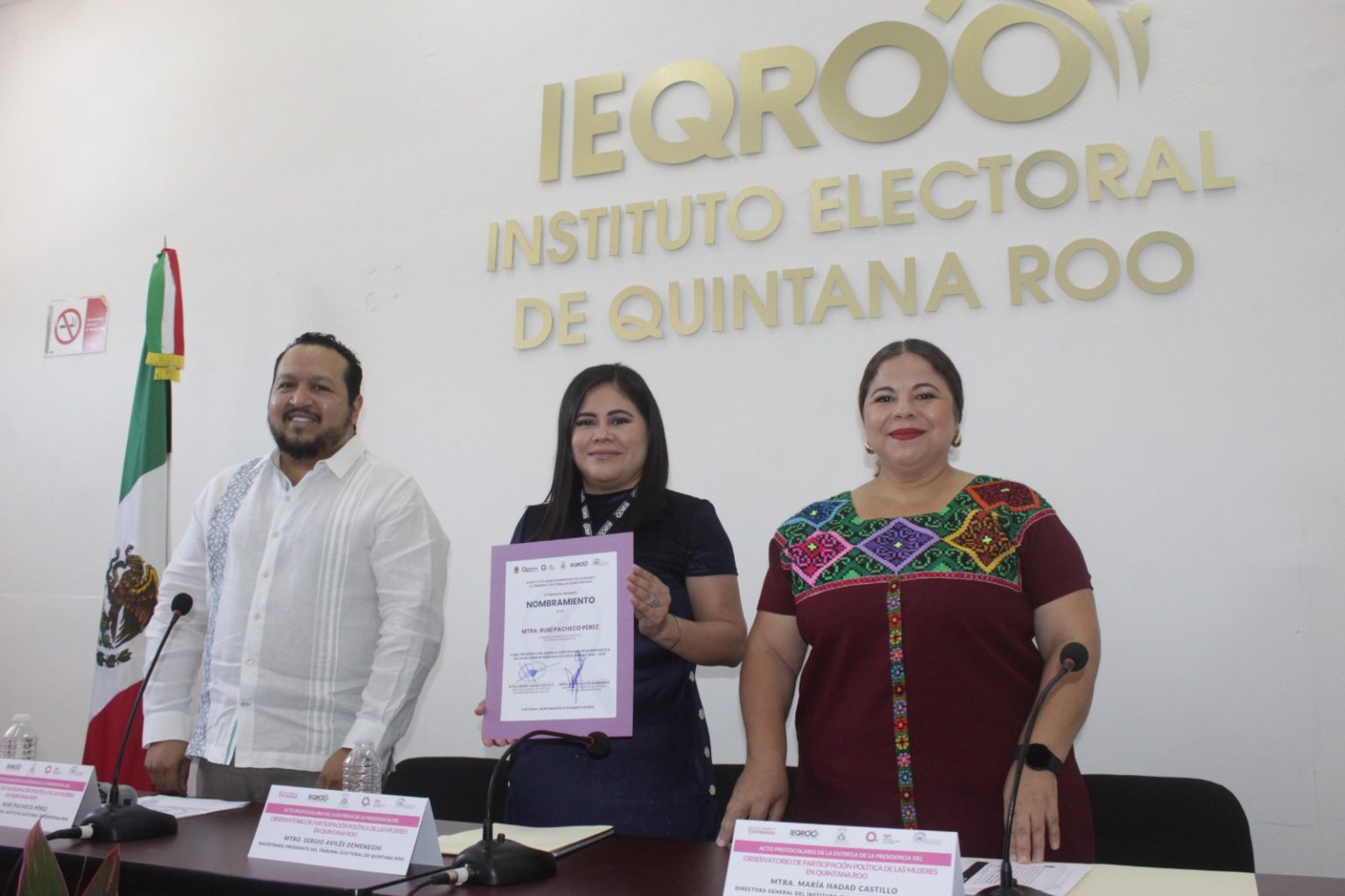 Chetumal, Quintana Roo, 06 de marzo de 2024. – La Consejera Presidenta del Instituto Electoral de Quintana Roo (IEQROO) Rubí Pacheco Pérez, tomó protesta de la operatividad del Observatorio de Participación Política de las Mujeres en el estado de Quintana Roo, en un acto protocolario en la sala de sesiones del Instituto, a cargo del Magistrado Presidente del TEQROO Sergio Avilés Demeneghi. Evento que contó con la presencia de la Directora General del Instituto Quintanarroense de la Mujer (IQM), María Hadad Castillo.