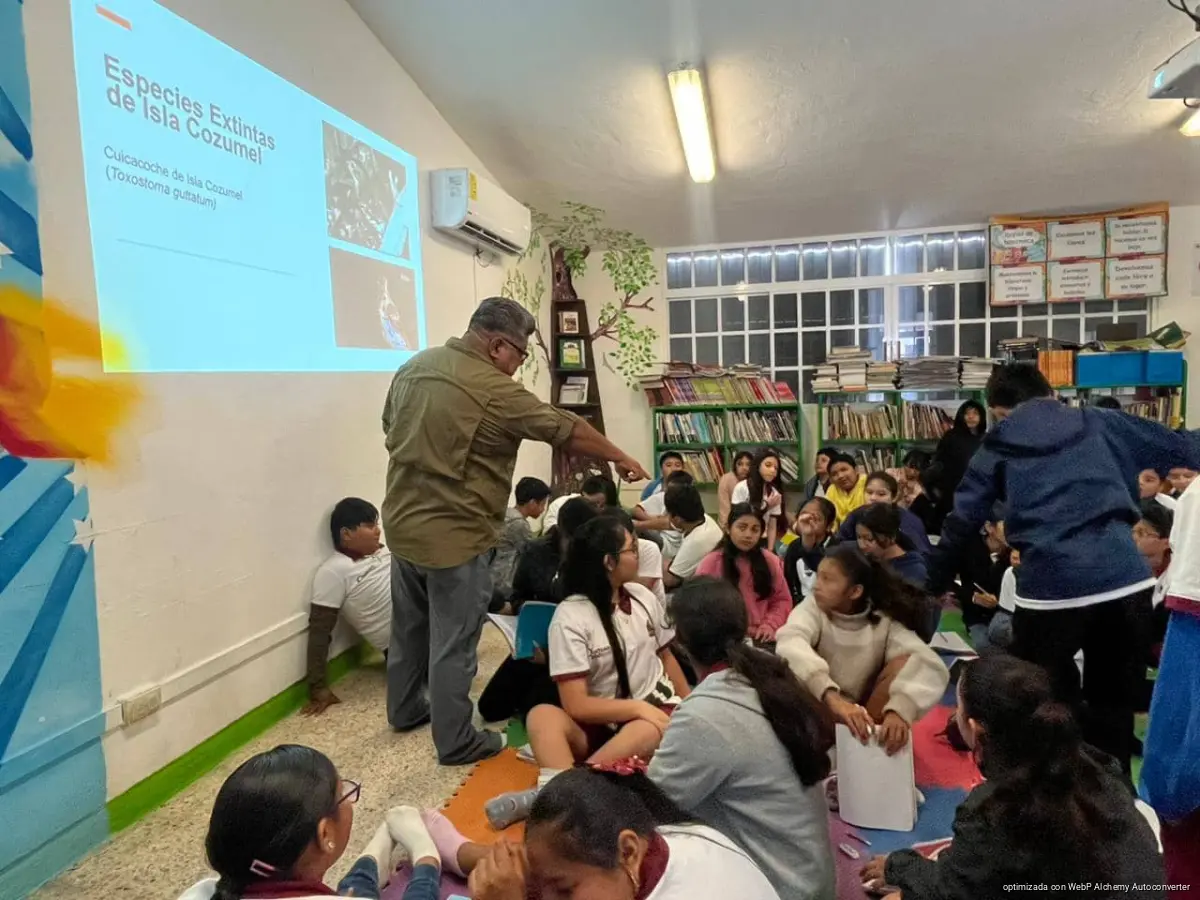 Durante la actividad, las y los estudiantes participaron en una presentación interactiva en la que se abordaron temas como los ecosistemas insulares, la importancia de los manglares y sus servicios ecosistémicos, así como las especies endémicas de Cozumel y su valor ecológico.