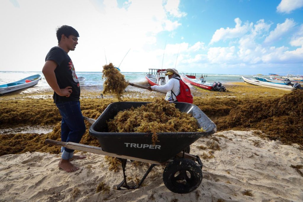 Reportan recale masivo en las costas de Solidaridad, playenses y trabajadores del Ayuntamiento, trabajan a marchas forzadas para recolectar el alga.