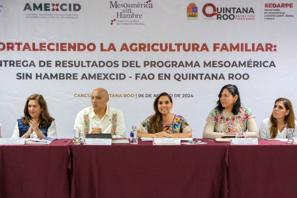CANCÚN, Quintana Roo, 6 de Agosto.-Para contribuir a mejorar e incrementar la producción de alimentos, impulsar el desarrollo comunitario de las zonas rurales, generar bienestar con justicia social y elevar calidad de vida de las familias del sector agropecuario, la Agencia Mexicana de Cooperación Internacional para el Desarrollo (AMEXCID-FAO) y la Organización de las Naciones Unidas para la Alimentación y la Agricultura (FAO), entregó a la gobernadora Mara Lezama Espinosa los resultados del Programa “Mesoamérica sin Hambre AMEXCID-FAO)” en Quintana Roo.