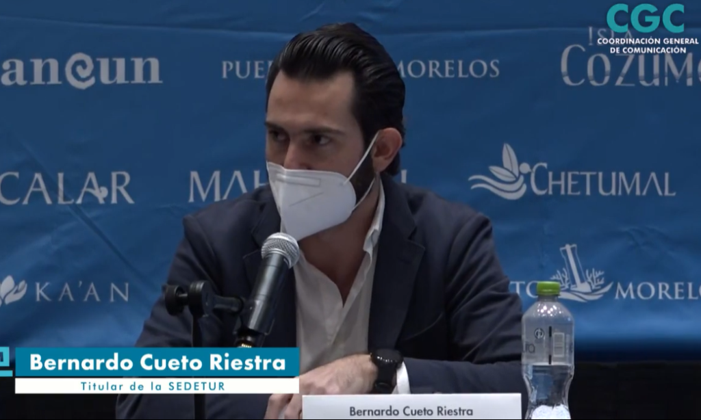 En conferencia de prensa, sobre el informe de resultados de la Feria Internacional de Turismo (Fitur) 2022, en Madrid, España. Bernardo Cueta minimizó el asesinato de los tres canadienses (vinculados al crimen organizado internacional) en el Hotel Xcaret, y el homicidio del gerente de Mamitas Beach Club, en Playa del Carmen.