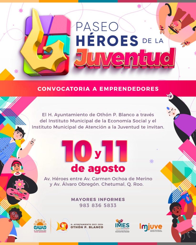 CHETUMAL, Quintana Roo,5 de Agosto.- El Ayuntamiento de Othón P. Blanco, a través del Instituto Municipal de la Economía Social y el Instituto Municipal de Atención a la Juventud, hicieron extensiva la invitación a las personas emprendedoras para que participen en la nueva edición del “Paseo Héroes de la Juventud”, que tendrá lugar el próximo 10 y 11 de agosto a lo largo de la icónica avenida Héroes de Chetumal.