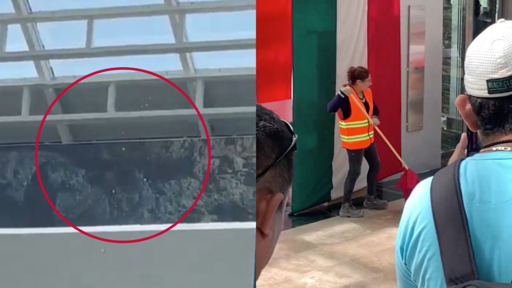 En uno de los videos se ve a los asistentes al evento, entre ellos reporteros y un grupo de baile, parados adentro del recinto, mientras el agua se filtra por diversas partes del techo y algunos de los militares limpian los charcos que se formaron en el suelo, justo en la zona donde esperaban los invitados al presidente.