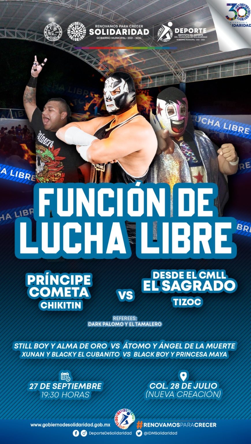 Playa del Carmen, Quintana Roo, 26 de septiembre. – Uno de los rudos más temidos y respetados del pancracio nacional, El Sagrado, llegará para hacer de las suyas en el ring que se instalará en el domo de la colonia 28 de julio (Nueva Creación), que se convertirá en una arena de lucha libre, será el miércoles 27 de septiembre a partir de las 19:30 horas cuando rudos y técnicos se enfrenten para deleite de la afición, que día a día aumenta gracias a la promoción del programa “Lucha Libre en tu Colonia”, que ofrece de manera gratuita el Gobierno Municipal de Solidaridad, que encabeza la Lic. Lili Campos, a través del Instituto del Deporte Municipal.
