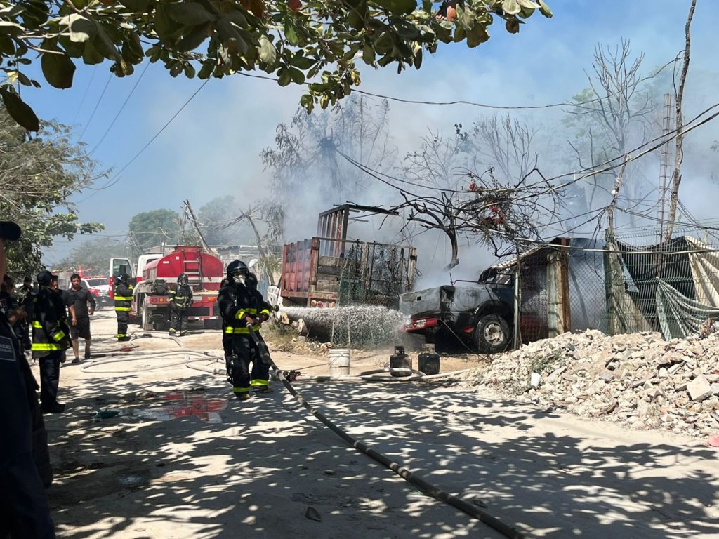 Playa del Carmen, Quintana Roo, 29 de marzo de 2024. – La mañana de este viernes se registra un fuerte incendio en la zona de invasión conocida como las Torres, en Playa del Carmen, que consume un total de tres viviendas y un automóvil sin que se reporten personas intoxicadas o lesionadas.