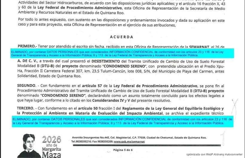 PLAYA DEL CARMEN, Quintana Roo, 04 de abril de 2026.- La Secretaría de Medio Ambiente y Recursos Naturales (Semarnat) determinó no autorizar el proyecto para la construcción del condominio “Sereno” en Xpu-Ha, luego de que el promovente, Desarrollo Xpu Ha Beach, desistiera formalmente de continuar con el trámite.