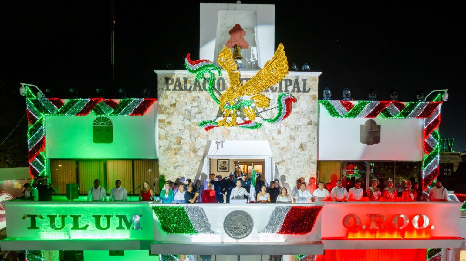 La multitud, emocionada y comprometida con su historia y cultura, recibió inmediatamente después al alcalde, quien dio inicio al protocolo oficial de la noche. Esto incluyó la entonación de los Himnos a Quintana Roo y el Himno Nacional Mexicano, seguido del tradicional Grito de Independencia. Desde el balcón principal del Palacio Municipal de Tulum, ondeando con orgullo el lábaro patrio, el Presidente Municipal proclamó: “¡Viva México!”, obteniendo como respuesta un enérgico “¡Viva!” por parte de todos los presentes.