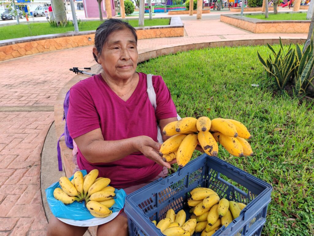 Doña Narcisa Jiménez y Chí, productora y vendedora de plátano, explicó que los fuertes vientos y las lluvias han causado daños significativos en las plantaciones, derribando matas y destrozando hojas.