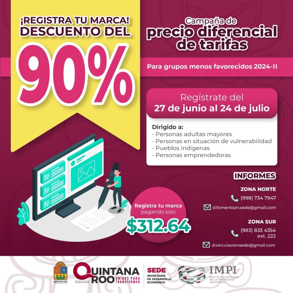 CHETUMAL, Quintana Roo, 16 de Julio.- Con el objetivo de impulsar a las empresas y emprendedoras y emprendedores de Quintana Roo que cuenten con registro de marca de sus productos, la Secretaría de Desarrollo Económico (SEDE) en coordinación con el Instituto Mexicano de la Propiedad Industrial (IMPI) ponen en marcha el “Programa de Precio Diferencial para Grupos Menos Favorecidos 2024-II”.