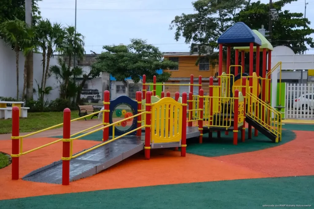 La rehabilitación incluyó el cambio de 600 metros cuadrados de piso de caucho en el área de juegos, renovación del pasto en áreas verdes, instalación de juegos inclusivos, acondicionamiento del área de picnic, rehabilitación de baños, trabajos de pintura, colocación de bancas y botes de basura, creando un entorno seguro, digno e incluyente para niñas, niños, adolescentes y familias cozumeleñas.