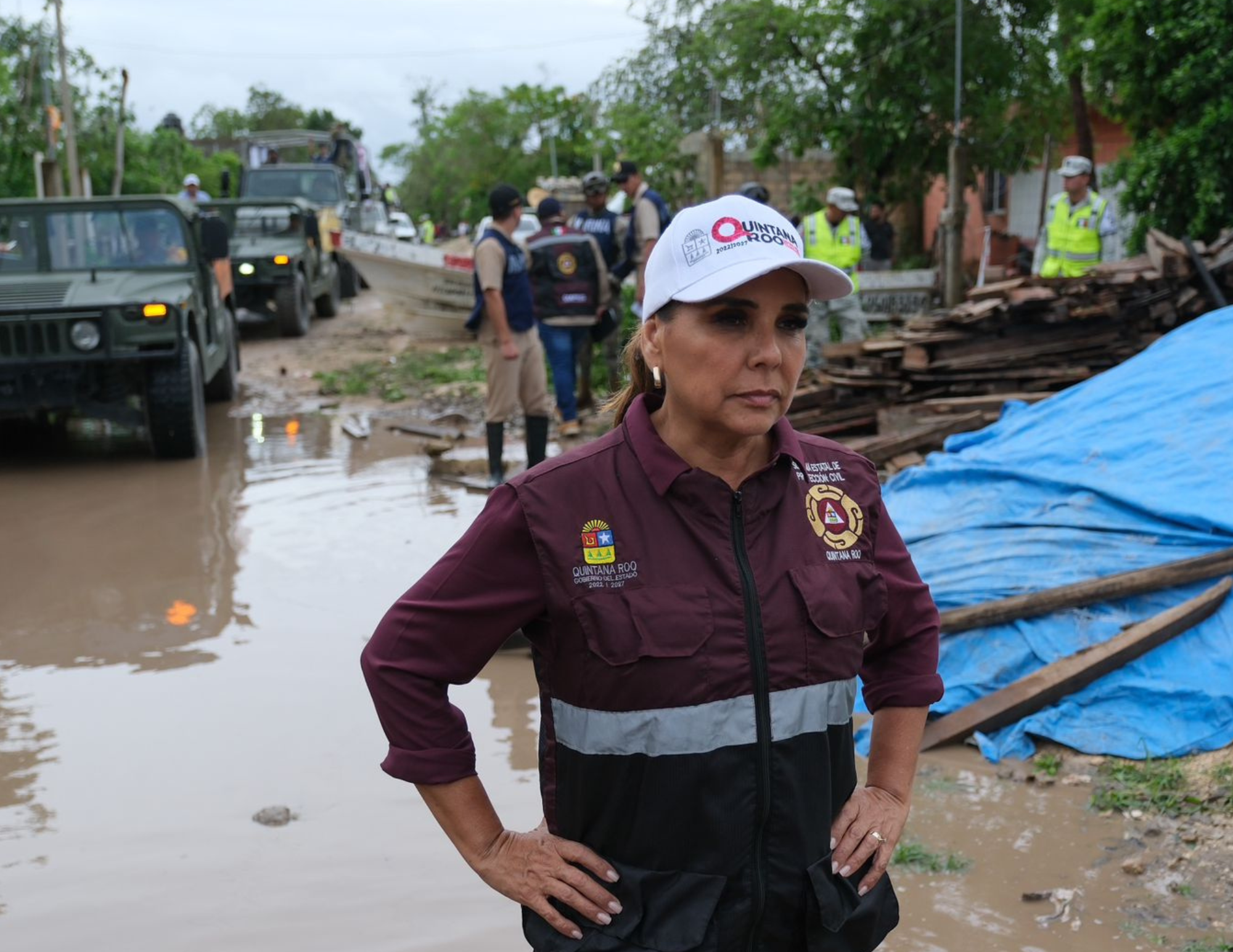 TULUM, Quintana Roo, 5 de Julio.- Familias que viven en colonias vulnerables de Tulum y que resultaron afectadas por las torrenciales lluvias y fuertes rachas de vientos que dejó el huracán “Beryl” recibieron la visita de la gobernadora Mara Lezama Espinosa, acompañada del presidente Diego Castañón y autoridades del Ejército, la Marina y Guardia Nacional.